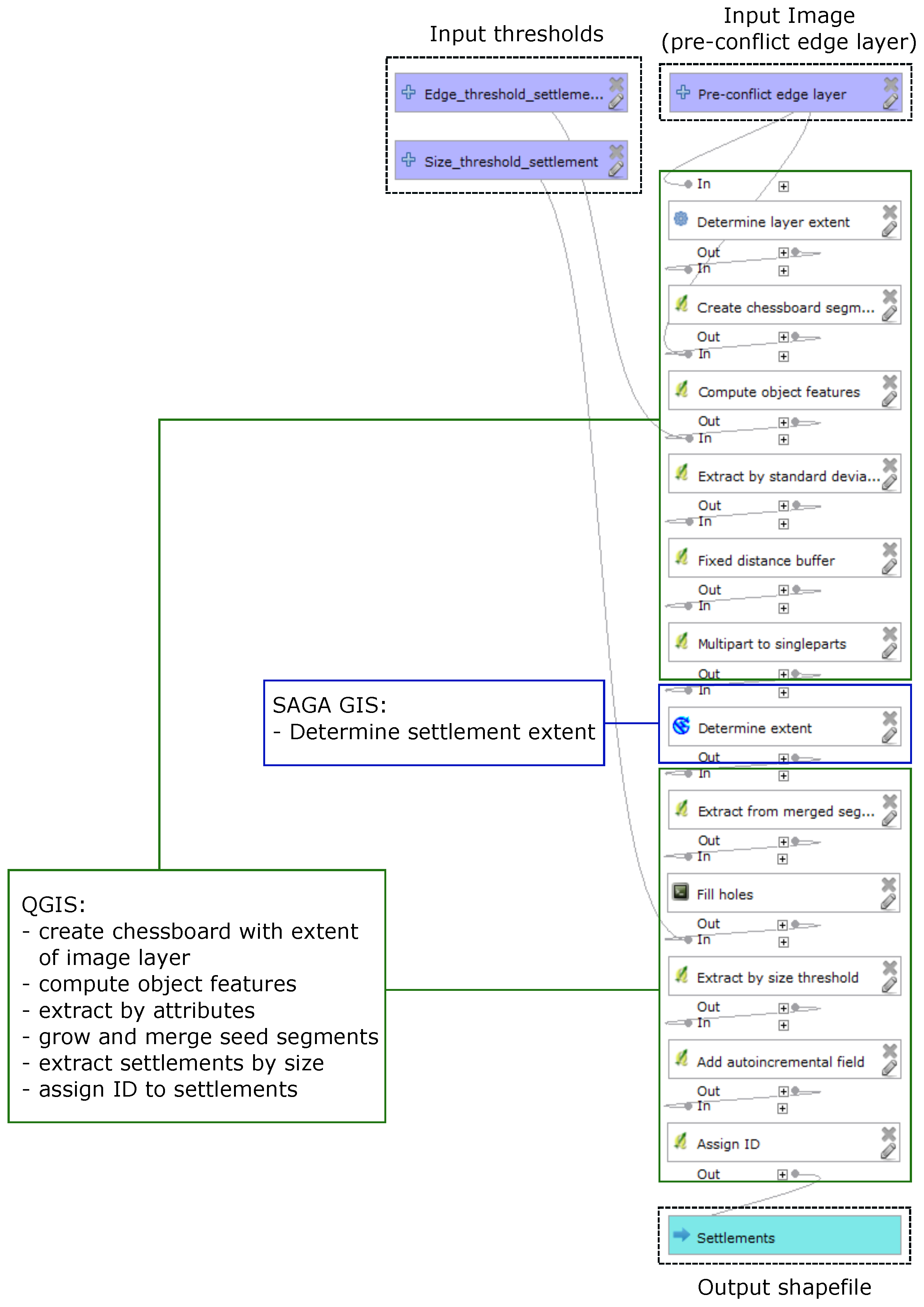 | Create settlement area objects by growing and merging candidate segments that are within proximity (100 m max) to each other (ignore isolated candidates) | QGIS: Fixed distance buffer QGIS:Multipart to singleparts SAGA:Polygon shape indices QGIS:Extract by attribute QGIS:Fill holes | Settlement detection |