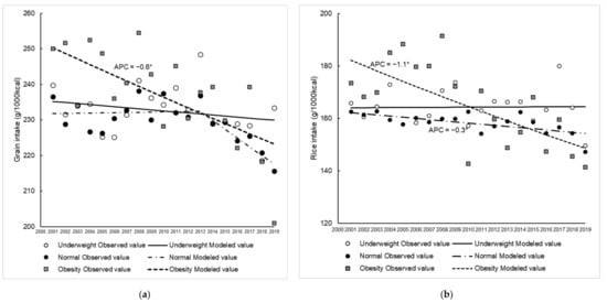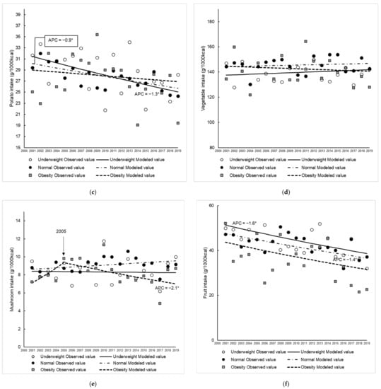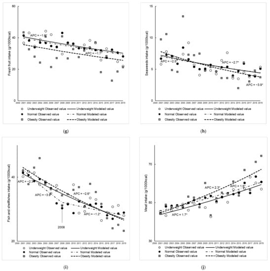 Figure 3a–n and Supplementary Table S2 show the trends in food group intakes between 2001 and 2019. In all groups, seaweed, fish, and shellfish intake decreased over time, whereas meat intake increased significantly in all groups. Grain intake in the obese group (APC = −0.6%) and rice intake in the normal (APC = −0.3%) and obese (APC = −1.1%) groups decreased over time. In the underweight and normal groups, the trend in potato intake also showed significant decreases with APC values of −1.3% and 0.9%, respectively, and a similar trend was observed for fruit intake (APC; underweight: −1.6%, normal: −1.4%), especially fresh fruit intake (APC; underweight: −1.6%, normal: −1.7%). Additionally, dairy product intake decreased sharply in the underweight group until 2004 and in the normal group until 2003 and did not change thereafter. In the obese group, an increase in confectionary intake was observed (APC = 1.9%). For beverage intake, an increasing trend was observed in the normal group between 2001 and 2004 (APC = 11.1%) and in the obese group between 2001 and 2019 (APC = 1.4%). Moreover, the trend in soft drink intake increased significantly in all groups (APC of 6.9% in the underweight group, 6.9% in the normal group, and 5.8% in the obese group).