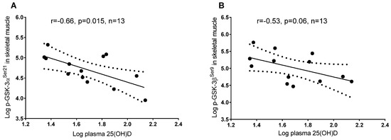 In skeletal muscle, a higher plasma 25(OH)D concentration was associated with lower phosphorylation of GSK-3 αSer21 and βSer9, but the latter did not reach significance (p = 0.06), whereas in adipose tissue 25(OH)D was associated with a higher phosphorylation of GSK-3 αSer21 and βSer9 (Figure 2). In adipose tissue, a higher plasma 25(OH)D concentration was associated with greater phosphorylation of AktSer473 and IRS-1Ser312 (Figure 2), whereas these associations were not detected in skeletal muscle (p = 0.99 and p = 0.56, respectively; data not shown). Tyrosine phosphorylation of IRS-1Tyr612 in adipose tissue and skeletal muscle did not correlate with 25(OH)D concentrations (p = 0.95 and p = 0.3, respectively; data not shown). GSK-3 αSer21 and βSer9 phosphorylation was associated with higher phosphorylated AktSer473 in adipose tissue (Figure 3) but not in skeletal muscle (p = 0.93 and p = 0.6, respectively; data not shown).