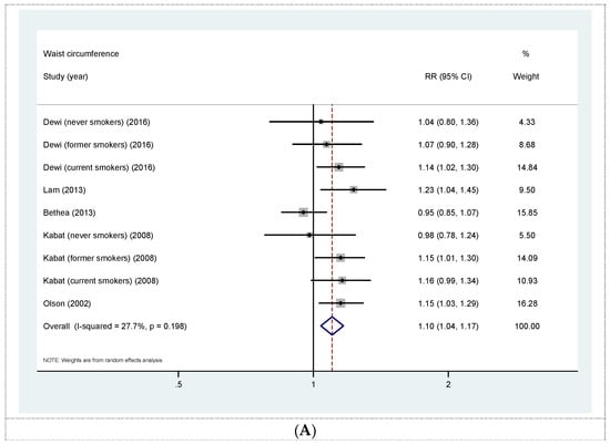 Five prospective cohort studies [18,19,20,21,23] were eligible for the analysis of WC and risk of lung cancer. All studies concerning this association were further adjusted for BMI. The summary RR for a 10 cm increase in WC was 1.10 (95% CI 1.04, 1.17) with moderate heterogeneity (I2 = 27.7%, p = 0.198) (Figure 2A). No evidence of publication bias was observed across studies (Begg, p = 0.404; Egger, p = 0.842). The summary RRs according to smoking status were 1.11 (95% CI 1.00, 1.23) for never smokers, 1.12 (95% CI 1.03, 1.22) for former smokers, and 1.16 (95% CI 1.08, 1.25) for current smokers (Figure 2B). Sensitivity analysis investigating the influence of a single study on the overall risk estimate by omitting one study at each turn yielded a range of RRs from 1.09 (95% CI 1.01, 1.18) to 1.13 (95% CI 1.08, 1.19). Furthermore, the summary RR for the highest versus lowest categories of WC was 1.32 (95% CI 1.13, 1.54) with low heterogeneity (I2 = 18.2%, p = 0.281) (Online Supplementary Materials Figure S1).