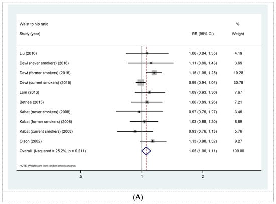 Six prospective cohort studies [18,19,20,21,23,24] were eligible for the analysis of WHR and risk of lung cancer. The summary RR for a 0.1 unit increase in WHR was 1.05 (95% CI 1.00, 1.11) with moderate heterogeneity (I2 = 25.2%, p = 0.211) (Figure 3A). No evidence of publication bias was observed across studies (Begg, p = 0.851; Egger, p = 0.962). The summary RRs according to smoking status were 1.07 (95% CI 0.94, 1.21) for never smokers, 1.11 (95% CI 1.00, 1.23) for former smokers, and 0.99 (95% CI 0.94, 1.04) for current smokers (Figure 3B). In a sensitivity analyses in which we omitted one study at a time, the overall association became slightly attenuated (RR 1.05, 95% CI 0.98, 1.12) by excluding the study by Dewi et al. [21]. In addition, the summary RR for the highest versus lowest categories of WC was 1.10 (95% CI 1.00, 1.23) with low heterogeneity (I2 = 24.2%, p = 0.211) (Online Supplementary Materials Figure S2).