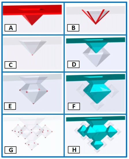Octahedral 3D-fractal fabrication scheme, showing in (A–D) the evolution of the first generation (1G), in (E,F) the fabrication of the second generation (2G) and in (G,H) the realization of the third generation (3G) fractals (adapted from []).