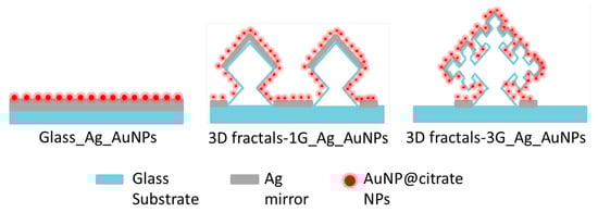 Following the fabrication of 3D fractals, they were metallized with silver (99.99% silver pellets from Kurt J. Lesker Company, Jefferson Hills, PA, USA) via electron beam evaporation (Edwards auto-500, 3∙10−7 mbar, 32 mA, 5.3 KV). In a second step, gold nanoparticles (Au@citrate NPs) were assembled on the substrates by electrostatic interactions to generate a 3D monolayer-over-mirror configuration. For such purposes, the SERS substrates were incubated in a poly(diallyl-dimethilammonium) chloride aqueous solution (PDDA), 0.2% wt for 4 h; followed by rinsing with deionized water. Afterwards, the substrates were immersed in Au@citrate nanoparticles solution (0.19 mg/mL) for 16 h at 4 °C. Then the SERS substrates were rinsed with deionized water and dried at room temperature. Table 1 shows the main characteristics of the SERS active substrates studied in this work, where reference samples used for comparison purposes are also included.