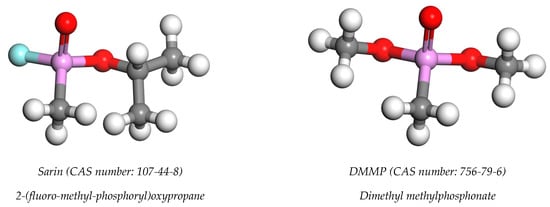 Structural analogies of Sarin and dimethyl methylphosphonate (DMMP) surrogate. Color legend: P, purple; F, blue; C, grey; O, red; and H, white.