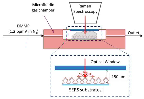 SERS experiments for detection of traces of CWA vapors were carried out with DMMP, often used as a Sarin gas simulant thanks to its chemical structure similarities (Figure 3) and its much lower toxicity. For measuring DMMP in gas phase, the SERS substrate was mounted on a home-made gas chamber (2.7 × 10−2 cm3) placed at an angle of 90° with respect to the 785 nm laser excitation beam (Figure 4). A nitrogen stream (10 STP cm3 min−1) was passed through a bubbler containing liquid DMMP, placed in a thermal bath at room temperature, and fed to the microfluidic chamber. The SERS measurements were immediately performed without any stabilization period. The value of the concentration of DMMP in the feed stream was calibrated with a permeation tube (MT-PD-Experimental, 107-100-7845-HE3-C50) of known concentration and corresponds to 1.2 ppmV. The 785 nm excitation laser was coupled through 20× objective (Numerical Aperture, N.A., 0.5; spot diameter 1.9 µm) or 50× objective (N.A., 0.8; spot diameter 1.2 µm) respectively. The SERS spectra are shown after baseline subtraction using WITec Control 1.60.