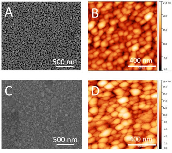 SEM and topological AFM images of SiO2 surfaces upon metallization with 12 nm (A) and (B) and 77 nm (C) and (D) of Ag, respectively.