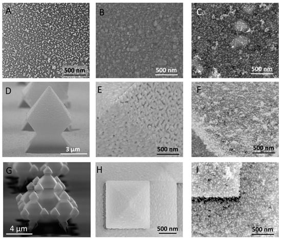 SEM characterization of the SERS substrates herein studied. (A) Glass_AuNPs, (B) Glass_Ag, (C) Glass_Ag_AuNPs, (D) Bare 1G fractal, (E) Silver-coated 1G fractal (1G_Ag) (F) SERS active 1G fractal (1G_Ag_AuNPs), (G) Bare 3G fractal, (H) Silver-coated 3G fractal (3G_Ag), (I) SERS active 3G fractal (3G_Ag_AuNPs).