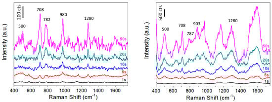 SERS response of Glass_Ag_AuNPs (left) and Glass_AuNPs (right) samples upon exposure to DMMP vapor (1.2 ppmV) as a function of integration time. Acquisition conditions: 50×, 5 mW.