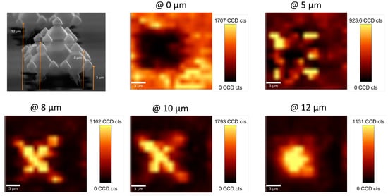 To obtain an estimation of the EM enhancement on the fractal structures, the Raman signal was collected at selected z-positions in a mapping area of 20 × 20 µm (1 spectrum/µm), see Figure 9. Bright areas represent higher Raman intensity and comparing the xy-images at different z-positions, i.e., 5, 8, 10 and 12 µm from the ground level, it is evident the higher electromagnetic field on the corners, apices or tips of the microstructures. This enhancement is modest, just 1.7 folds higher, when compared with those exhibited by Sierspinki fractals with feature sizes of 150 nm []. However, due to the higher extension of the 3D fractal structures in the z direction, 12 µm vs. 40 nm, larger interfacial area for gas-solid contact and improved limit of detection for gas sensing could be expected.