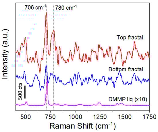 Figure 10 comparatively shows the recorded SERS spectra on a 1G_Ag_AuNPs sample upon exposure to DMMP in vapor phase (1.2 ppmV) with the focus plane at two z-positions: 0 µm (bottom part of the fractal) and 5 µm (top part of the fractal). The most intense signal is appearing at 706 cm−1 for both heights, tentatively assigned to the P-C stretching mode and used as Raman reference line. However, when focused at z = 0 the signal-to-noise ratio hinders its proper identification. In addition, the characteristic peak of DMMP at 780 cm−1, attributed to PO2 bending, is clearly observed on the top of the fractals. Both peaks are shifted with respect to normal Raman of the DMMP in liquid phase. This observation agrees with the hydrogen bonding type interactions between citrate from Au NPs and DMMP molecule, as described in the literature []. The citrate coating acts as an effective trap for the target molecules in the immediate vicinity of the metallic surface where the maximum electromagnetic enhancement is achieved. It is important to note that the spectra in Figure 10 are taken at 1s integration time, under these conditions a value of around 2000 cts is obtained, indicating a large enhancement of the electromagnetic field in the vicinity of the molecule. When the spectra were taken at longer acquisition times, the signal around 1600 cm−1 corresponding to amorphous carbon appeared, indicating that the high energy concentrated on the molecule was able to burn it. A similar result was obtained when 3G fractals were used for measurements. Thus, we can conclude that in the case of the DMMP molecule the energy should be modulated to avoid decomposition of the molecule and a trade-off between electromagnetic field enhancement and stability of the molecule should be achieved.
