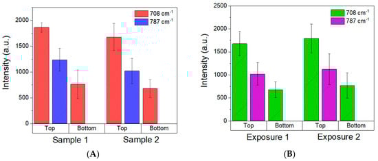 Column diagram represents the SERS intensity of the DMMP modes 708 and 787 cm−1 measured (A) on the different 1G_Ag_AuNP upon the exposure to DMMP (1.2 ppmV) and (B) on the same 1G_Ag_AuNP upon the double exposure to DMMP (1.2 ppmV). The SERS intensities are the average of 6 spots at different sample position, the error bars are the intensity standard deviation. Acquisition conditions: 5 mW and 1 s.