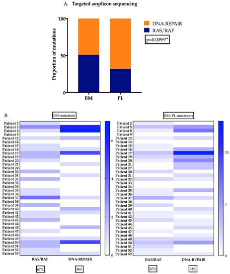 Analysis of TAS results indicated that the prevalence of mutations in the DNA-repair pathway was significantly higher than RAS-RAF pathway mutations when information from either the BM or PL was evaluated (Chi-square test, p =0.0095, Figure 5A). Furthermore, when the proportion of patients harbouring RAS-RAF and/or DNA-repair pathway mutations in the BM or BM + PL was compared it demonstrated that RAS-RAF pathway mutations were of equivalent frequency (67% for both BM and PL), whereas for the DNA-repair genes the proportion increased from 38% (BM) to 61% (BM + PL) (Figure 5B). The median AF of mutations detected in the BM or PL when compared between RAS-RAF and DNA-repair revealed that the median AF of RAS-RAF pathway mutations was significantly higher, both in the BM and PL compared to DNA-repair gene mutations (p < 0.0001 and p = 0.0039 respectively, Figure 5C,D). Finally, 16% of the patients had mutations in DNA-repair genes exclusively in the PL compared to only 2.5% of RAS-RAF pathway genes mutations (Table S1, data not shown).