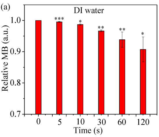 Methylene blue (MB) was used to assess the relative concentration of hydroxyl radicals (•OH). It is known that MB reacts with •OH aqueous solutions, leading to a visible color change [41]. As shown in Figure 4, the relative MB concentration decreases with treatment time of He µCAP. The relative MB concentration decreases by 9.3% after He µCAP-treated DI water for 120 s. While this change is significant, He µCAP-treated DMEM showed a stronger degradation action (14.7%), suggesting that more short-living reactive species are generated in DMEM. Plasma reacting with DMEM might form a new product that reacts with methylene blue, which may explain why He Μcap-treated DMEM showed a stronger degradation action than DI water. Overall, these findings demonstrate that there is an increase in the relative concentration of •OH as a function of µCAP treatment time.