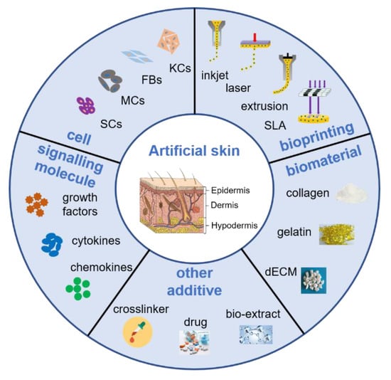 Schematic representation of the main requirements related to 3D bioprinting for skin regeneration. The artificial skin was printed by inkjet, laser, extrusion or stereolithography (SLA) bioprinting technologies with a cell-encapsulating bioink, which consists of biomaterials, constituent cells, stem cells and signaling molecules, or acellular bioink which contains biomaterials only. The mechanical property of artificial skin was enhanced by adding crosslinker, and some drugs or bio-extract were adding to obtain multifunctional skin for wound healing, such as anti-inflammatory and antibacterial. Abbreviations: KCs: Keratinocytes, FBs: Fibroblasts; MCs: Melanocytes, SCs: Stem cells, dECM: Decellularized extracellular matrix.