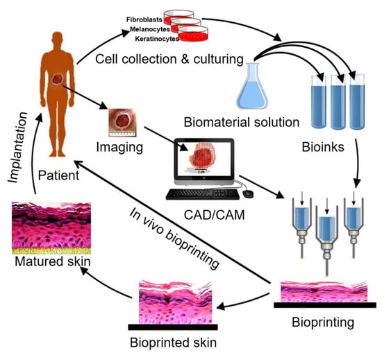 The basic process of 3D bioprinting skin. Various cells like keratinocytes, fibroblasts and melanocytes are collected from the patient and cultured in a cell culture system. A suitable biomaterial is mixed with the cells and the formed bioink is fed to the bioprinting system. Then the skin is printed with appropriate 3D bioprinting technology according to the 3D pattern that is captured from the wound using CAD/CAM approaches. The printed skin could be directly printed to the wound surface or cultured under appropriate conditions to obtain mature skin for transplantation. Adapted from [], under open access license.