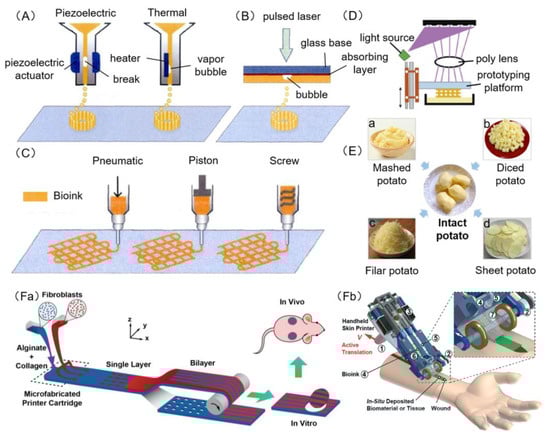 Inkjet bioprinting is a contactless printing that ejects biomaterials and cells from the nozzle in the form of liquid droplets [] (Figure 3A). Laser bioprinting is a printing technology that irradiates high energy laser pulses onto a thin plate coated with laser absorbing material, and the bubble produced by the bioink on the absorbing layer drives the biomaterial and cells to leave the substrate and deposit onto the platform [] (Figure 3B). Extrusion bioprinting uses air pressure or a mechanically driven nozzle to extrude bioink and to deposit it on a platform to form a two-dimensional structure. With the movement of the nozzle or the forming platform along the z-axis, the bioink accumulates in a layered manner to form a three-dimensional structure [] (Figure 3C). Stereolithography bioprinting is a system that uses a projected light source such as a UV bulb or laser to polymerize a polymer solution into a specified pattern [,] (Figure 3D). The traditional 3D bioprinting, including laser, inkjet, extrusion and stereolithography bioprinting, are like the reverse process of cutting potatoes—assembling potatoes from mashed potato, diced potato, filar potato and sheet potato, respectively (Figure 3E). Microfluidic bioprinting uses micro-printing equipment based on microfluidic technology, and is different from traditional bioprinters as it is capable of printing artificial skin in a shorter period of time [,] (Figure 3Fa,Fb).