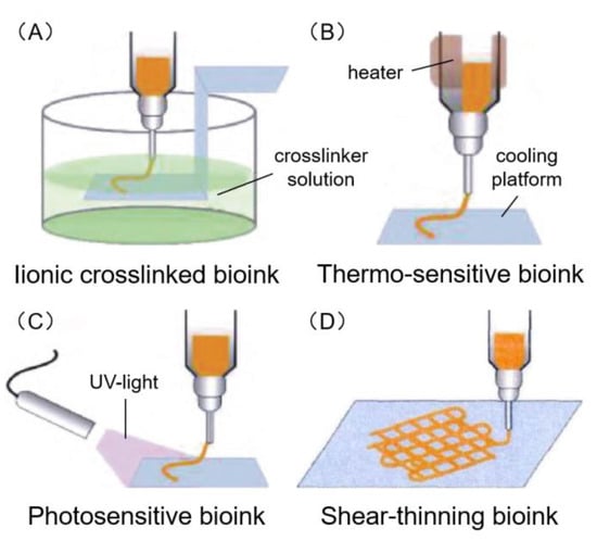 Four common types of bioink. (A) Ionic crosslinking bioink mainly performs the solidification through ionic crosslinking reaction. (B) Thermo-sensitive bioink mainly performs the transformation from sol to gel state by heating or cooling. (C) Photosensitive bioink mainly performs the transformation from sol to gel state by activating the light initiator in bioink. (D) Shear-thinning bioink mainly performs the solidification through shear force. The viscosity of some materials decreases with the increase of shear stress, while gelation on the platform occurs with no shear stress. Adapted with permission from []; copyright Journal of Zhejiang University (Engineering Science), 2019.
