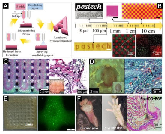 - Kim, B.S.; Kwon, Y.W.; Kong, J.S.; Park, G.T.; Gao, G.; Han, W.; Kim, M.B.; Lee, H.; Kim, J.H.; Cho, D.W. 3D cell printing of in vitro stabilized skin model and in vivo pre-vascularized skin patch using tissue-specific extracellular matrix bioink: A step towards advanced skin tissue engineering. Biomaterials 2018, 168, 38–53. [Google Scholar] [CrossRef]