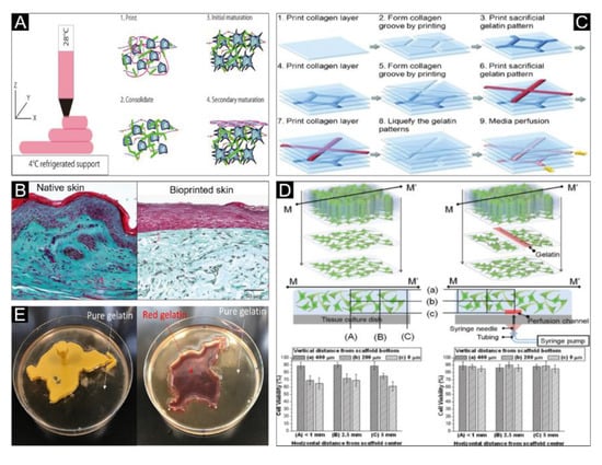 A newly developed bioink composed of gelatin, alginate, fibrinogen and fibroblasts has been reported to closely model the structure of human skin at the macroscopic and molecular level [] (Figure 6A,B). Similarly, a fibrin-gelatin hybrid bioink has also been prepared to fabricate a hydrogel with inoculated fibroblasts for skin bioprinting []. Furthermore, 3D skin structures have also been printed using a collagen/gelatin hydrogel, where the gelatin pattern was printed into the collagen groove under 20 °C, and the gelatin was selectively liquefied and removed under 40 °C in an incubator to form a fluid channel scaffold (Figure 6C) []. The results demonstrated that, compared to skin scaffolds without fluid channels, skin scaffolds with fluid channels had significantly better cell viability (Figure 6D). Ionic crosslinked bioink has also been combined with a thermo-sensitive bioink. For example, a mixed hydrogel composed of gelatin and alginate was casted around the wound mold with Ca2+ ionic and placed in 4 °C for gelation (Figure 6E) before printing a skin graft on the burn wound bed by in situ bioprinting [].