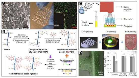 - Pereira, R.F.; Barrias, C.C.; Bartolo, P.J.; Granja, P.L. Cell-instructive pectin hydrogels crosslinked via thiol-norbornene photo-click chemistry for skin tissue engineering. Acta Biomater. 2018, 66, 282–293. [Google Scholar] [CrossRef] [PubMed]