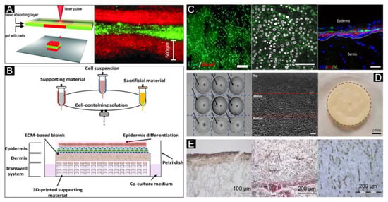 Collagen is the most abundant protein in the dermis and is widely used in skin tissue engineering. As such, the combination of collagen, fibroblasts and keratinocytes has been used as bioink for laser bioprinting of human skin structures (Figure 8A) []. For hybrid 3D cell-printing the use of extrusion and inkjet modules at the same time have been proposed []. Collagen with polycaprolactone (PCL) mesh, to prevent its contraction during tissue maturation, and fibroblasts have been reportedly used as bioink to print dermis by extrusion bioprinting on a polydimethylsiloxane (PDMS)-based microfluidic device. At the same time, keratinocytes were printed by inkjet bioprinting, where keratinocytes were evenly distributed on the dermis to produce a multilayered skin structure. (Figure 8B). The results show that the bioprinted structure supports the growth and protein secretion of the cells (Figure 8C). Similarly, a full-thickness skin model has been produced by using a collagen-based bioink with fibroblasts for dermis printing, followed by subsequent air–liquid interface culture for the inoculation of keratinocytes and melanocytes []. A collagen-based bioink to fabricate 3D biomimetic hierarchical porous structures by two-step drop-on-demand bioprinting has allowed for successful skin bioprinting []. Compared to traditional methods, this 3D bioprinted skin had uniform cell distribution, distinct layering, uniform coloring, good biological performance and revealed a high degree of similarity to human skin morphology (Figure 8D).
