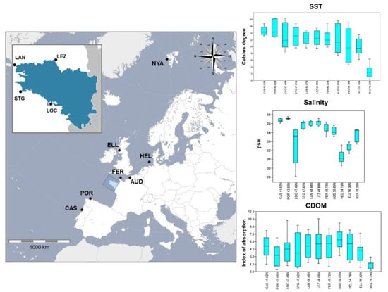 Map of the 11 sampling sites for the S. latissima sporophytes analyzed in this study. The insert shows the precise position of the four Brittany (France) sampling localities. See Supplementary Materials Table S1A for the detailed description of the 11 sampling sites. The box-plots shown on the right-hand side of the map display within-site variation for three environmental variables: sea surface temperature (SST), salinity, and chromophoric dissolved organic material (CDOM). The localities (x-axis) are ordered by latitude (south to north from left to right).