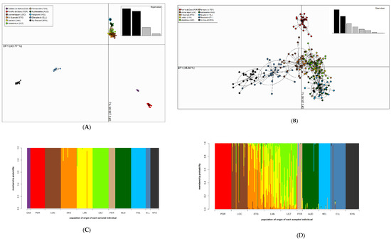 Discriminant analysis of principal components (DAPC) scatterplot and compoplot for (A,C) 199 S. latissima sporophytes sampled from 11 localities (see key) that were genotyped at 4069 SNP markers, and (B,D) 280 S. latissima sporophytes sampled from 10 localities (see key) genotyped at 18 SSR markers. (A,C) display the first two components (axes 1 and 2) of the DAPC. Sampling localities, which were specified a priori for the DAPC, are differentiated by color and inertia ellipses. Each point corresponds to a single individual. (B,D) show DAPC posterior probability of membership of each of the analyzed S. latissima sporophytes (each sample is represented by a vertical bar) to each of the sampling sites (each represented by a unique color).