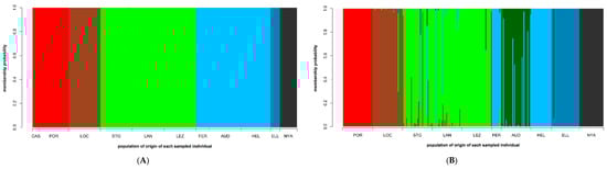 (A) Membership probability of the 199 S. latissima sporophytes (each sample is represented by a vertical bar) to each of six genetic clusters (each represented by a unique color) that were determined by the snapclust algorithm that was run on this set of samples utilizing 4069 SNP markers (see Supplementary Materials Figure S3A,B). The sampling locality of each individual is specified along the x-axis. (B) Membership probability of the 280 S. latissima sporophytes (each sample is represented by a vertical bar) to each of seven genetic clusters (each represented by a unique color) that were determined by the snapclust algorithm that was run on this set of samples utilizing 18 SSR markers (see Supplementary Materials Figure S3C,D). The sampling locality of each individual is specified along the x-axis.