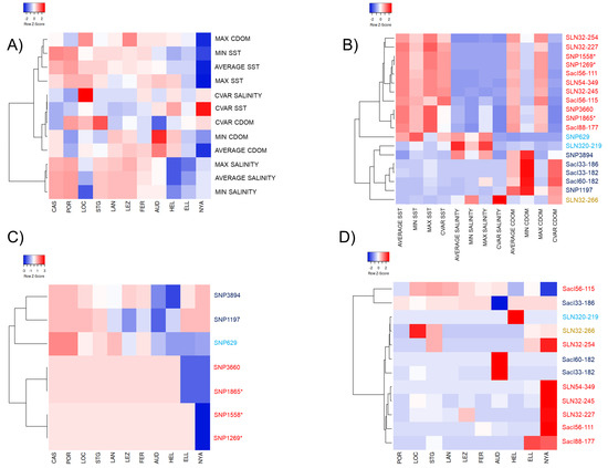 The graphical projection of the coefficient of determination (R2) for the SNPs and SSR alleles which correlated significantly with the 12 environmental parameters identified four main clusters of associations. The first cluster comprised four SNPs (SNP1269, SNP1558, SNP1865, SNP3660) and seven SSR alleles (Sacl56-111, Sacl56-115, Sacl88-177, SLN32-227, SLN32-245, SLN32-254, SLN54-349) (Figure 4B) that showed a general pattern of positive correlation with all SST and average/max-CDOM parameters and a negative correlation with salinity and cvar-CDOM (see the loci marked in red on Figure 4B). A second cluster comprised two SNPs (SNP1197, SNP3894) and three SSR alleles (Sacl33-182, Sacl33-186, Sacl60-182) showing positive correlation with average, min-CDOM, and cvar-CDOM (see loci in dark blue on Figure 4B). A third cluster comprised one SNP (SNP629) and one SSR allele (SLN320-219) that correlated positively with average and max-salinity (see loci in light blue on Figure 4B). The fourth cluster was represented by a single SSR allele (SLN32-266) that correlated positively with both min-salinity and cvar-salinity (see locus in ochre on Figure 4B).