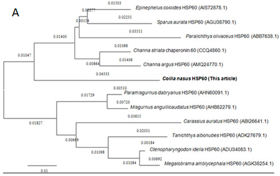 Amino acid sequences of HSP60 and HSP10 from different species were downloaded from the NCBI database for homology and phylogenetic analyses. BLAST analysis suggested that C. nasus HSP60 had higher sequence homology similarity with Clupea harengus (93%), Channa argus (89%), Danio rerio (89%), Epinephelus coioides (87%), Paralichthys olivaceus (87%), Tanichthys albonubes (86%), Megalobrama amblycephala (86%) and shared above 60% identity with other studied species’ HSP60s. HSP10 from C. nasus shared high homology with that from Danio rerio (96%), Salmo salar (96%), Ictalurus punctatus (95%), Xenopus laevis (89%), Epinephelus coioides (89%) and also shared above 60% identity with other studied species HSP10s. Phylogenetic trees were constructed by analyzing the amino acid sequences of C. nasus HSP60 and HSP10 with those from other species. Protein sequences of HSP60 and HSP10 were obtained from the NCBI data base, a neighbor-joining (NJ) phylogenetic tree indicated that the evolution of HSP60 and HSP10 was almost in accord with the evolution of species (Figure 2A,B).