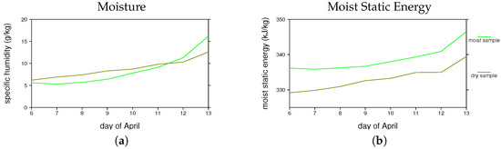 In Figure 9b,d,f, we consider the moist static energy budget of the two groups of air parcels. The dry sample starts with a substantially lower moist static energy on 17 January, which is largely due to the difference in the average height of the two samples (i.e., if the moist static energy is written as gz + Cp T + Lq, where g is gravity, z is height, Cp is the specific heat at constant pressure, T is temperature, L is the latent heat of vaporization, and q is specific humidity, then most of the difference in the two samples comes from the first term). While the increase in moist static energy is greater for the dry sample (Figure 9d,f), owing primarily to higher surface fluxes, it is not enough greater to close the gap. We conclude that the air in the aqua box, where it is heavily raining, has a higher moist static energy primarily because it started at a higher height three days prior.