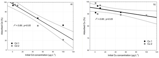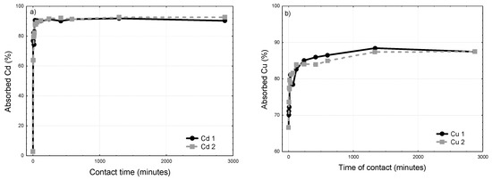 The difference in the sorption efficiency of heavy metal ions may be attributed to the different electronegativity of the metallic elements, the hydrated ionic radii in the solutions, the electric charge, the hydrolysis constant, etc. [29]. In our study, a comparison of the relative adsorption values of Cd and Cu shows similar total adsorption, the only difference being the rapidity of the adsorption of Cd as compared to Cu. This difference can be explained by differences in metal electronegativity and hydrolysis constants [29]. In fact, electronegativity values for Cu2+ and Cd2+ are 2.00 and 1.7, respectively [29,30], and the hydrolysis equilibrium pK values are 6.8 ± 1.5 for CuOH+ and 10.2 ± 1.6 for CdOH+ [31].