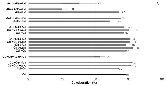 Our results showed that the only significant improvement of Ala’s adsorption was when Aclo followed in the solution (Figure 6), either in the presence or in the absence of TM. The positive effect of Aclo was not visible when it preceded Ala in the solution. It can be concluded that Aclo facilitates the sorption of Ala once adsorbed on SPM but more investigation should be done to understand the mechanisms involved in this interaction.