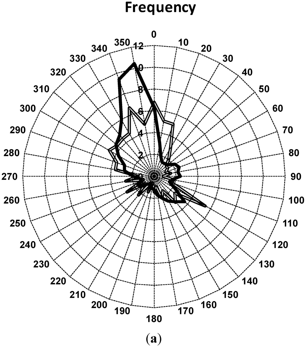 (a) Frequencies of wind (in %) with direction for the period 2002–2012, stations A (unfilled black line) and B (solid black line); (b) Average wind speeds (in m·s−1) with direction for the period 2002–2012, stations A (unfilled black line) and B (solid black line). Direction is defined as the direction from which the wind is blowing. The average wind speed is the mean value of wind speeds observed for each direction during the 2002–2012 period, without considering values of wind speed equal to zero.