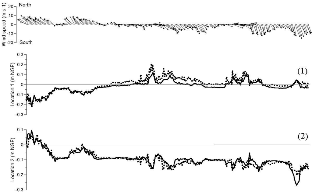 Measured wind vectors at the meteorological station B, measured and modeled water levels at locations 1–4, 6 and 7 (see Figure 1) from 24 May to 14 June 2010. Modeled water levels are shown with solid lines and measured water levels with dashed lines. Measured wind vectors at the meteorological station A are not represented for the sake of legibility of the figure.