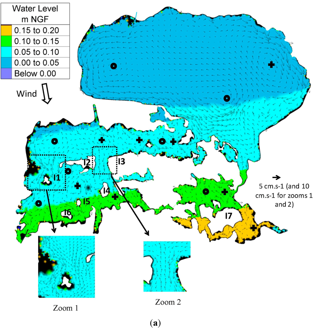 In the Impériaux lagoon, for the northwesterly wind, two north-south currents can be identified. The first takes place along the western shore (western part of the island I1) where, generally speaking, water flows towards the south, with counter flows towards the north along the east coast of this island and the west coast of the island I2 (see zoom 1). The second current is observed in the area between the islands I2 and I3: water flows overall towards the north in the central deeper area between I2 and I3, with counter flows towards the south in the higher parts of this area (situated along the shores of these two islands (see zoom 2). In the northern part of this lagoon, several circulatory gyres are observed, associated with complex currents. Five of these gyres are shown schematically in Figure 8a.