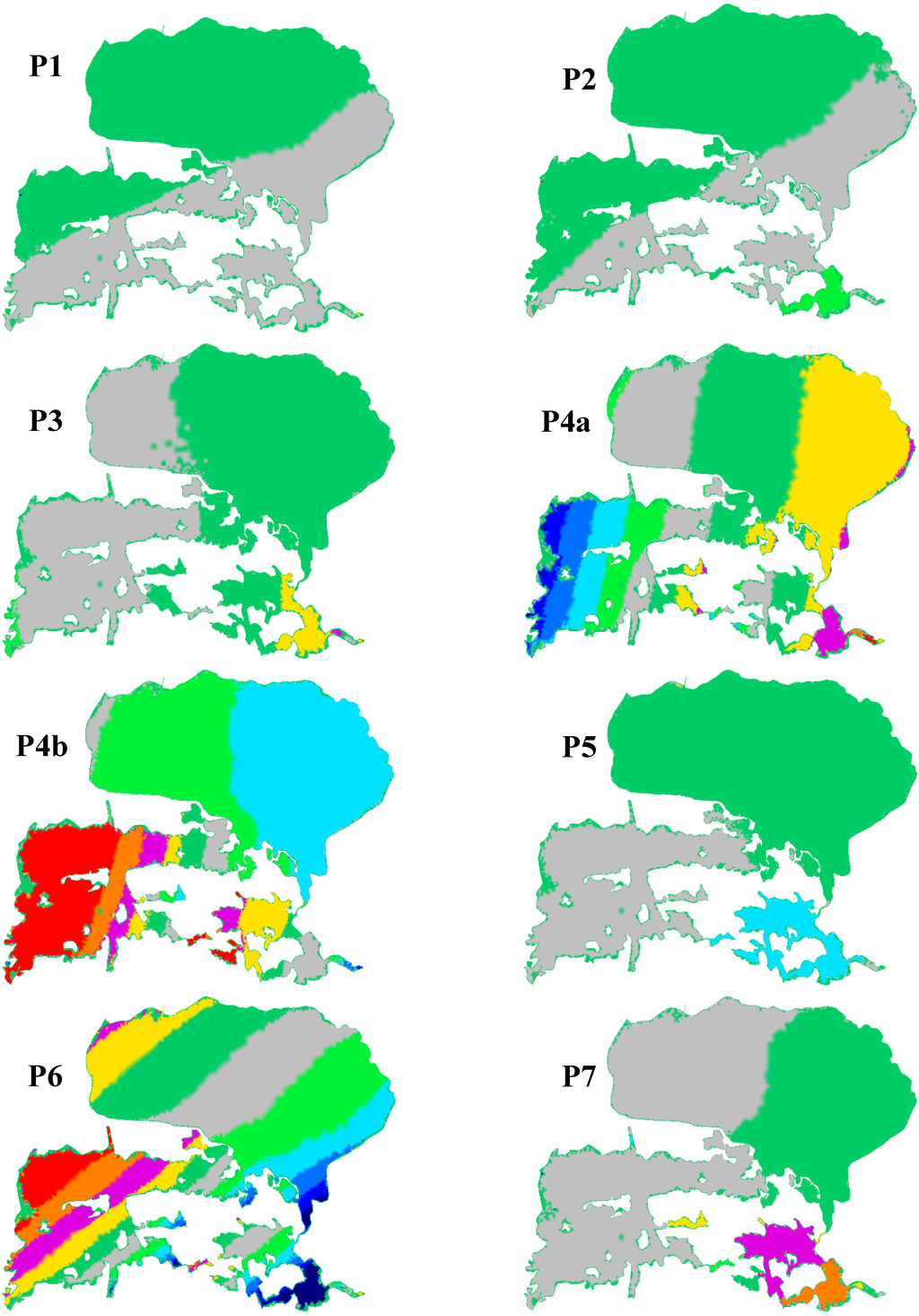 For period P7, there is mainly a transfer of water from the Impériaux lagoon into the Vaccarès lagoon, and from the Vaccarès lagoon into the Lion/Dame lagoon, explaining the positive mean variations observed in the Lion/Dame lagoon and in the eastern parts of the Vaccarès lagoon.