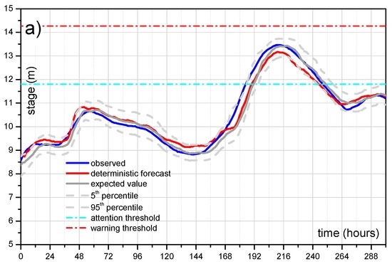 Furthermore, it is noteworthy that during the flood waves shown in Figure 7 and Figure 8 the observed stage has never reached the alarm threshold, which, properly, is never intersected by the uncertainty band estimated by MCP-MT. As concerns the warning threshold, it is actually exceeded only during the flood of August 2010 (see Figure 8b) as correctly forecasted by both the deterministic model and the MCP-MT uncertainty band.