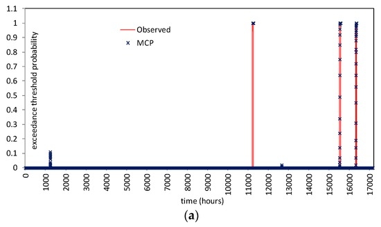 To investigate the benefit of the ETP estimate, a deep analysis on selected flood events is also shown in Figure 11 for the reach 2 case study and the longer lead-time equal to 24 h that represents the best information that could be provided to decision-makers. The analysis consists in comparing the binary observed exceedance (equal to 1 when the observed stage is above the threshold level and equal to 0 when it is below) and the exceeding probability computed by the MCP-MT within the selected forecast lead-time period (24 h) that is varying over time. For sake of completeness, the binary response of the deterministic model, that can be equal to 1 or 0, is also considered in the analysis. Figure 11a,b, which concerns two high flood events occurred at Polavaram section, shows the benefit obtainable using the PU estimate. Specifically, these figures effectively show the advantage of using probabilistic approaches able to provide probabilities in the range of 0–1 and not only the binary values 0/1, corresponding to the condition of threshold exceedance/non-exceedance.
