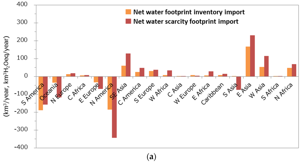 In regards to hydrological modelling, the state of current practices has been reviewed and the scientific and data-related challenges have been considered with a focus on human-water activities manifested through water resource management [35,36]. The H08 is used as one of the latest large-scale hydrological models to show how international trade helps control regional water demand. The results of our calculations include uncertainties due to modelling assumptions. In considering the uncertainties in meteorological forcing data, this study adopts an average result value using three meteorological forcing datasets. To evaluate uncertainties in groundwater withdrawal levels, we used the NNBW measure that has been validated as comparable to groundwater withdrawal levels reported for several arid aquifers. Although these results include uncertainties, this study presents new information and insights on water footprint and international food trade patterns from an LCA point of view. It is valuable to quantitatively assess the potential impacts of water use and virtual flows related to international food trade at a global scale in consideration of different water sources.