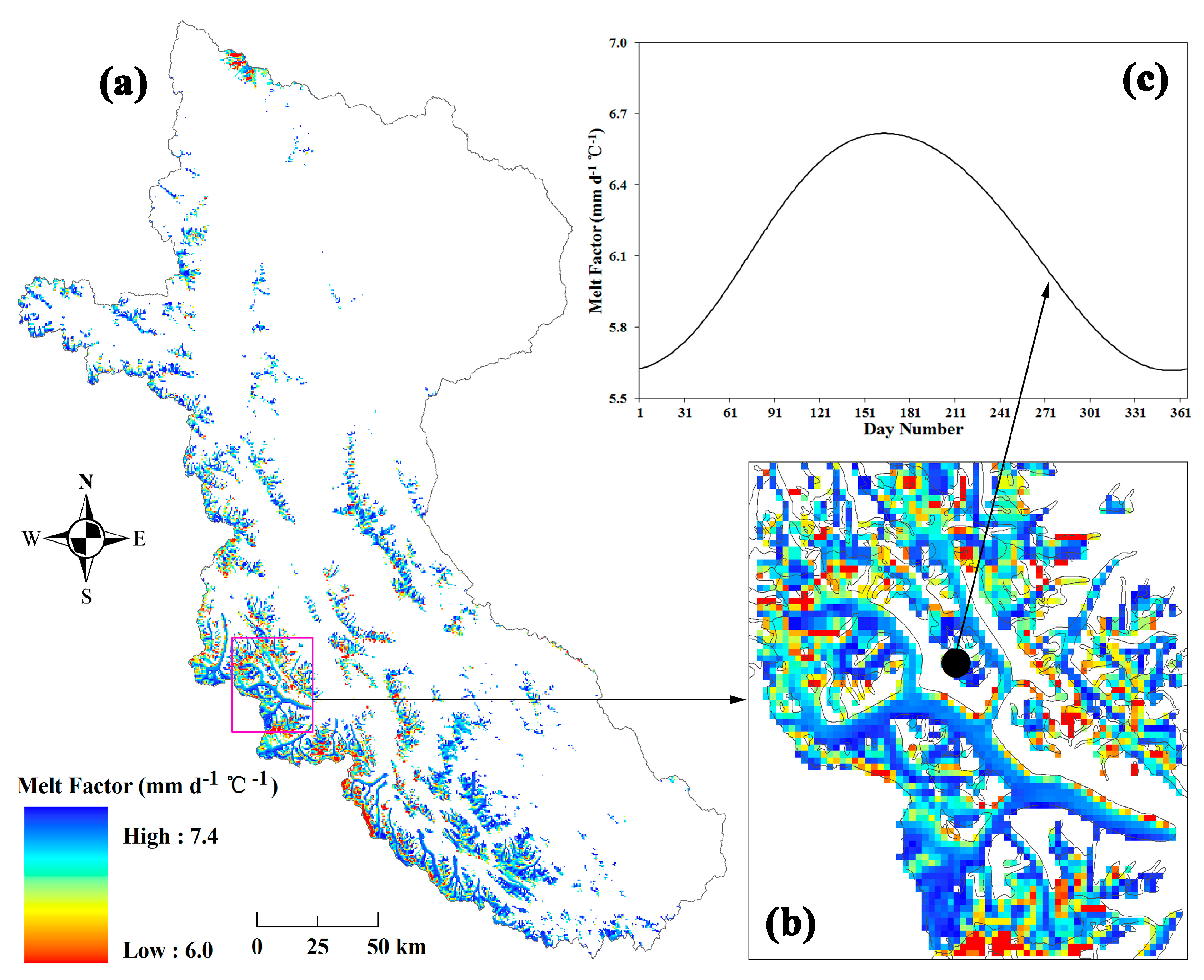 - Hock, R. A distributed temperature-index ice- and snowmelt model including potential direct solar radiation. J. Glaciol. 1999, 45, 101–111. [Google Scholar] [CrossRef]