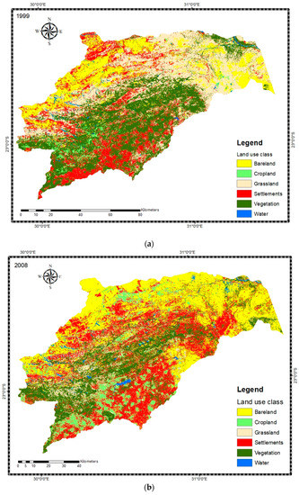 Landsat 6 and Landsat 8 satellite imagery for 1999, 2008 and 2018 were obtained from The United States Geological Survey (USGS). Landsat was chosen because it is the satellite with the longest earth observing history. The satellite images were ortho-rectified and subjected to atmospheric and radiometric corrections using ArcGIS 10.5 from the Environmental Systems Research Institute (ESRI), Redlands, California, United States of America (USA) [53,54]. Land cover for both images was classified and quantified using a pixel-based random forest supervised classification in ArcGIS 10.5. Random forest was chosen because it is robust, efficient, and produces better results as demonstrated in other studies [53,54]. Training samples were used to train the images for classification. The images were classified into six land-use types namely: water, bare land, vegetation, settlements, grassland and cropland. The classification was verified by extensive field visits and the use of Google Earth from Google, Alphabet Inc, Mountain View, California, USA [55]. The overall accuracy of the classification was 82%, with a producer accuracy of 84% and a user accuracy of 81%.