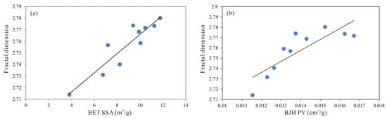 The higher TOC content indicated a more heterogeneous pore surface roughness and pore structural irregularity, consequently leading to larger fractal dimensions. But the fractal dimension D gradually stabilized when the TOC content became much higher (Figure 7d), which may suggest that the heterogeneity of the pores would probably have reached a maximum value when TOC content reached a certain concentration. In fact, the BET SSA and BJH PV also gradually stabilized when the TOC content became much higher (Figure 7a,b). Milliken et al. also found a similar variation tendency between TOC content and porosity when the TOC content is above 5.6% []. Wang et al. suggested that the excessive TOC content could decrease the brittleness and fracture density of the shale, which allow for easy compaction of the shale and minimal preservation of the pores [,]. Thus, perhaps the fractal dimensions will decrease with increasing TOC content when the TOC content exceeds a certain amount.