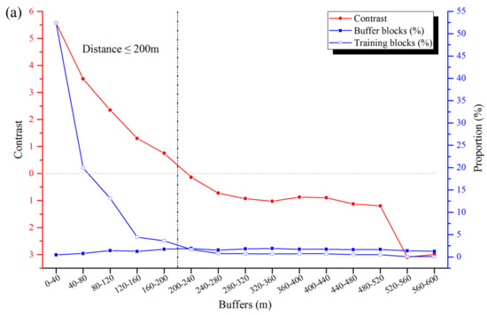 The study area for Yueshan intrusion and its surrounding areas are divided into a total of 278,0526 blocks by using a 40 m × 40 m × 40 m grid size, and the surface model of orebodies is voxelized into 3186 blocks with the same dimensions in the study area. We selected the concaves as abnormal zones (Figure 5b) from the contact zone of the Yueshan intrusion with |Kmin| > 0.0025. The 3D buffers that used to identify the influence range and degree of some point, line and surface geological objects [80,81,82], are constructed around these zones by calculating Euclidean distances between individual blocks in the study area. To analyze the spatial association of the Yueshan intrusion with orebodies, a series of WofE calculations were processed for different buffers with block dimensions. The calculation results (Table 1, Figure 6a) show that, all the training blocks are located in the buffers within the distance of 600 m which occupies 22.23% of the total blocks. From 40 m to 600 m, the positive weights decline approximately to −3.095 from 4.833, and the contrasts decline to −3.108 from 5.572. For the buffers within 200 m from the contact zone, they occupy 5.69% of the total blocks, but include 93.57% of training blocks; their positive contrasts suggest that the concaves zone we selected from the Yueshan intrusion contact must have positive constraints on the localization of orebodies (Figure 7). This indicates that the enrichment of the orebody is closely related to distance from contact zone of the Yueshan intrusion, much closer to the intrusion’s contact, and contributing more to mineralization.