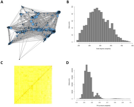 Characterization of a weighted and undirected peer-to-peer network (email correspondence [,]) with Forman-Ricci-curvature; (A) Network plot. Node sizes are scaled with respect to their node degrees; (B) (Weighted) node degree distribution; (C) Curvature map, representing the Forman-Ricci-curvature along the network’s edges. The curvature map consists of a heat map of a matrix where each entry represents the Ricci curvature of the corresponding edge . Light yellow entries resemble edges with low curvature, red entries resemble those with high curvature; (D) Histogram showing the distribution of the Forman-Ricci-curvature.