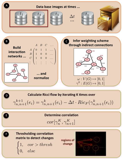 Schematic overview of the change detection workflow; (A) We consider a set of “snapshots” of a system or data base at discrete times with step size ; (B) We infer unweighted (binary) networks from each snapshot that represent the structure of the underlying data. To simplify comparison, we normalize all networks; (C) By superimposing weighting schemes based on “indirect connections”, we extend the unweighted networks to weighted ones (see Section 1); (D) We calculate the Ricci flow for each time step by iterating over a the given scheme; (E) For detection of changes, we compare the final (smoothed) weighting schemes after K iterations; (F) To identify regions that were subject to significant change, we threshold the correlation matrix obtained in (E). Light regions in the resulting map indicate such regions.