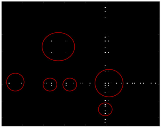 Detection of changes and regions of distinguished activity in Gnutella snapshots of two consecutive days [,] with Ricci flow and a parameter choice of and (the relatively small number of iteration steps was chosen for the sake of computation time). The figure shows a heat map of the correlation matrix of the edges’ Ricci-curvature. Highlighted spots correspond to single edges and assortments of edges and nodes (clusters) with high activity (flow).