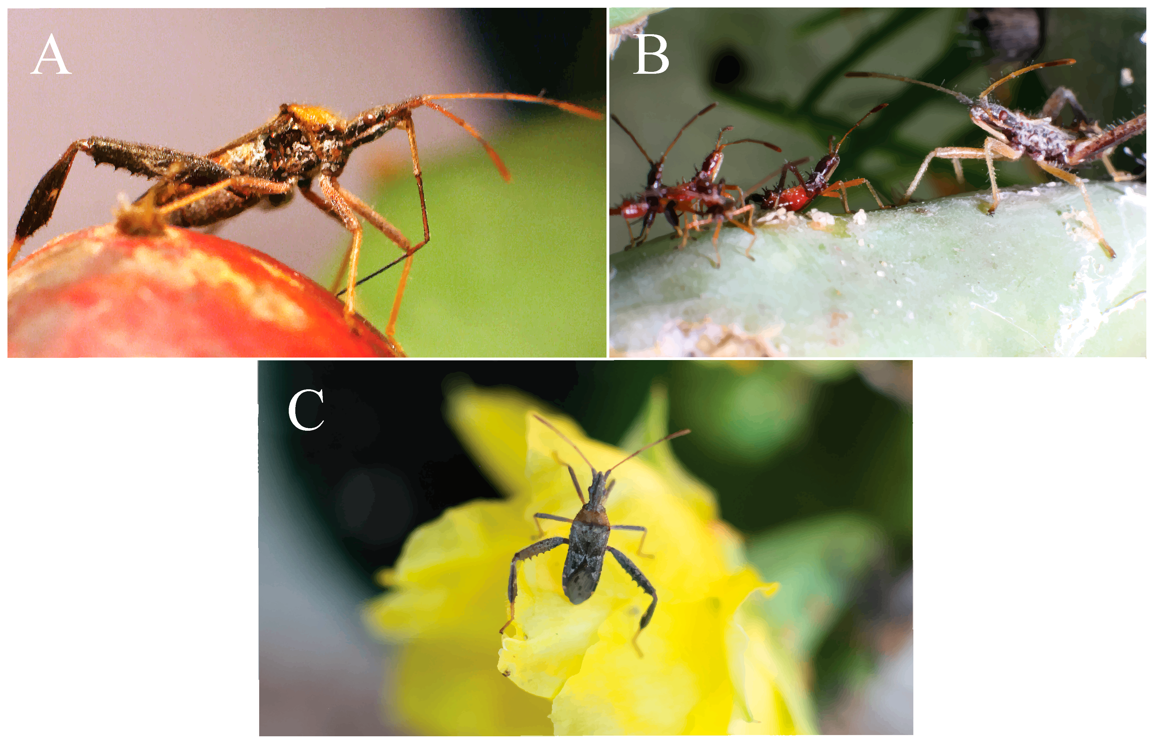 N. femorata in different life stages. (A) Adult N. femorata with its beak probing a red ripe fruit. (B) Nymph N. femorata in the third instar (left) and fifth instar (right). (C) Adult N. femorata on a cactus bloom. All photos credited to Christine W. Miller.