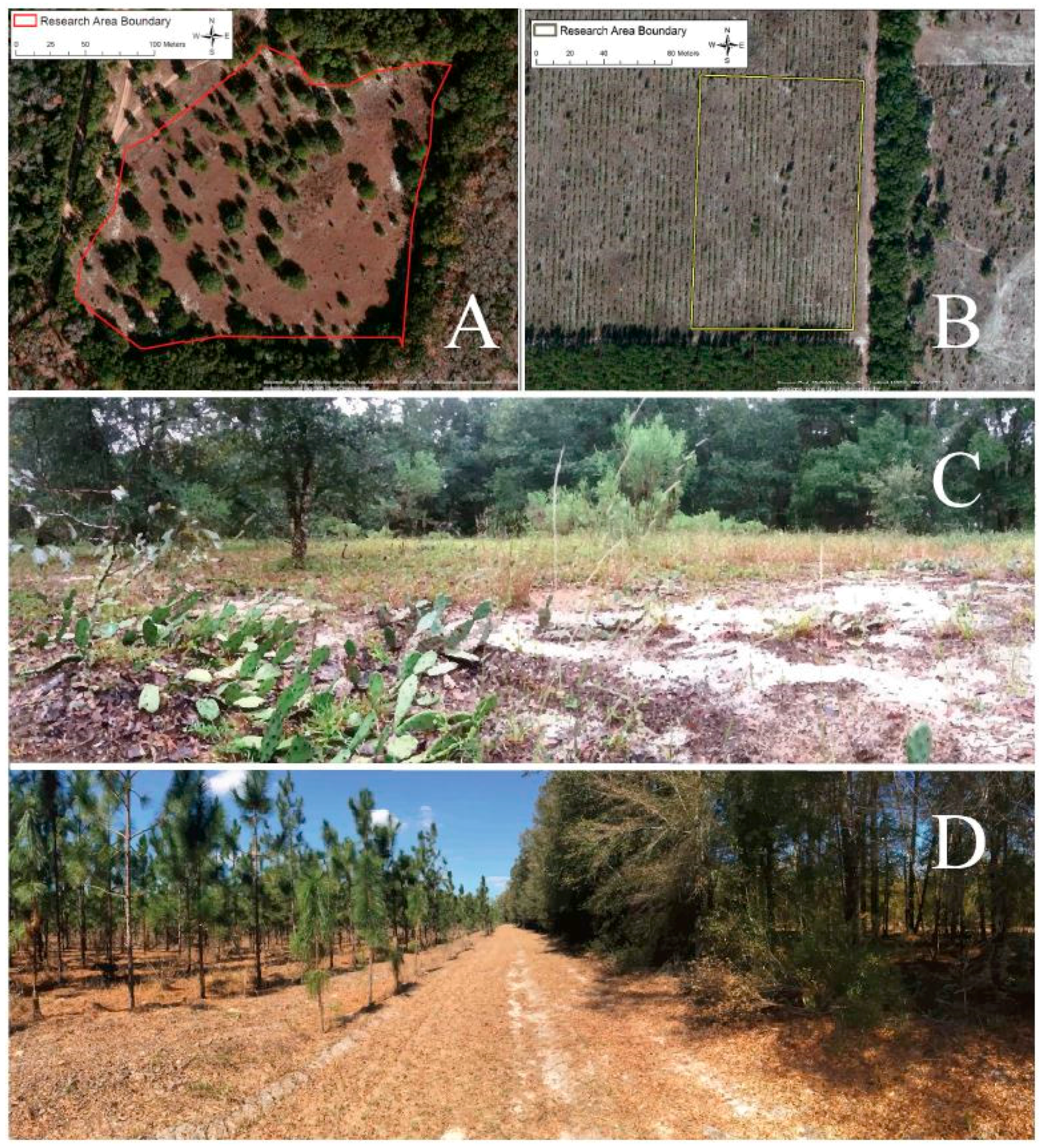All of the survey work was completed in North Central Florida in 2014–2015 [22]. Our primary site included a 41,338 square meter survey area and nearby cactus patches at the University of Florida Ordway-Swisher Biological Field Station in Melrose, Florida (Figure 2A). Fire management is one of the ecologically important practices carried out at this site which leads to routine burning and scarring of cactus plants. A combination of dormant and growing season prescribed burns maintain the longleaf pine-wiregrass community on the Station. We refer to this area as the “Protected Site.” A priori our goal was simply to measure temporal changes in insect phenotypes. However, we discovered a new field site during the work, and we seized the opportunity to add it for the last four months of the study to provide a spatial dimension to the work. This site is referred to as the “Agricultural Site.” The Agricultural Site included a 14,385 square meter survey area and nearby cactus patches at Future Farmers of America (FFA) agricultural plot in Live Oak, Florida (Figure 2B). This area is a pine plantation; longleaf pine trees are grown and harvested at this site every 15–18 years. Prickly pear cactus, O. mesacantha ssp. lata, are also unintentionally grown. While both sites have sandy soil, the two sites are strikingly different in plant community composition and structure. The Protected Site is comprised of a diverse mix of oaks, palmettos, pines, grasses, and herbaceous plants (Figure 2C); whereas, the Agricultural Site has reduced diversity, permitting growth of only a few species beyond longleaf pine trees and prickly pear cactus (Figure 2D). Importantly, herbivore abundance and community composition are likely quite different at the two sites. The Protected Site boasts abundant wildlife, including tortoise, deer, birds, and rodents, all important consumers of cactus fruit. Although the soil nutrient content of the sites is unknown, neither site has been artificially fertilized in the past ten years [49].
