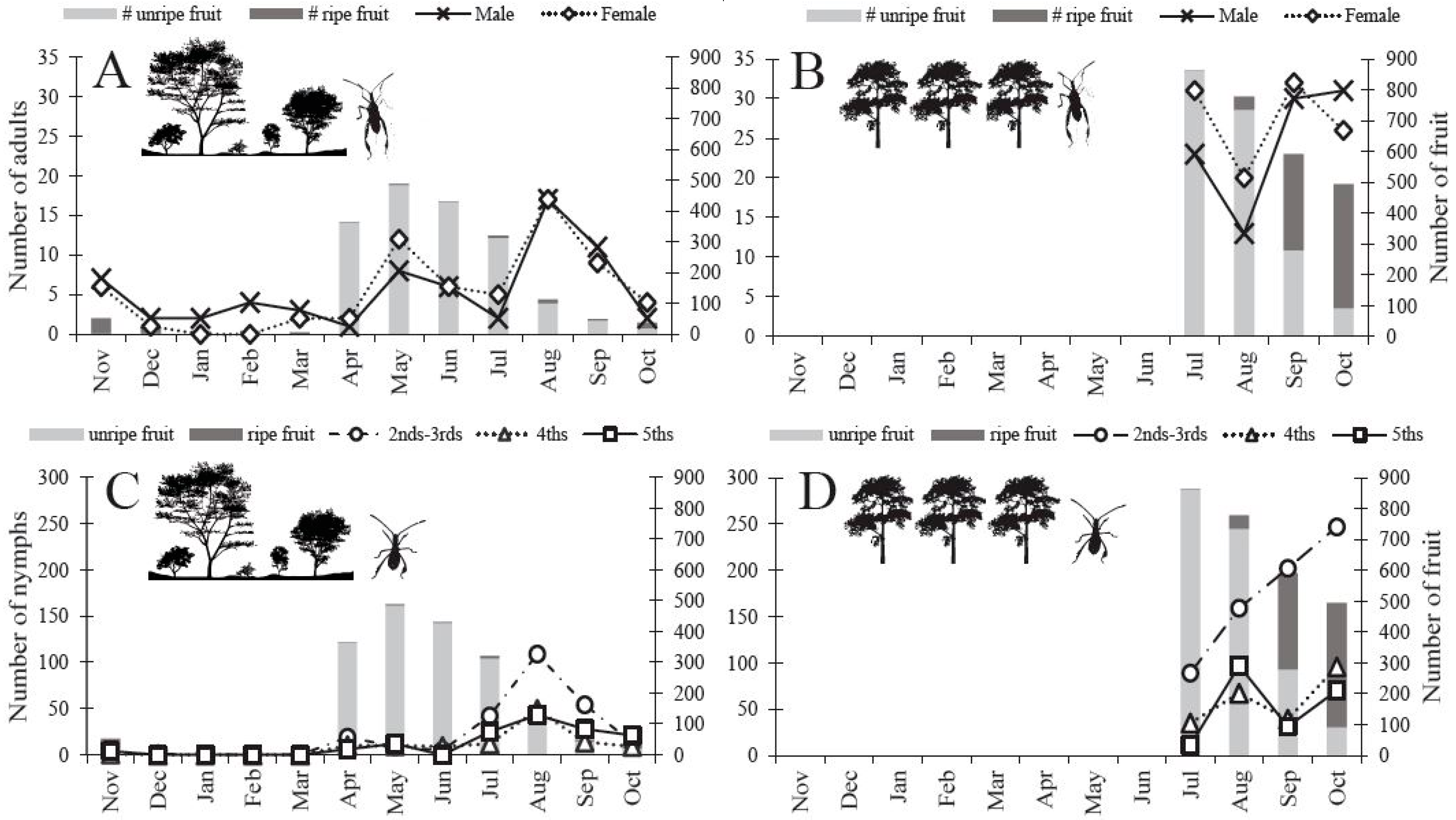 N. femorata abundance (per sampling location) and cactus fruit phenology (per 20 cactus patches) from the insect sampling study 2014–2015 for both the Protected Site and the Agricultural Site. Both cactus blooms and green fruit were classified as ”unripe fruit” (light gray bar), “ripe fruit” (dark gray bar) includes only red cactus fruit. (A–B) N. femorata abundance for adults (C–D) and nymphs in 2014–2015. (A) Adults in the Protected and (B) Agricultural sites and (C) nymphs in the Protected and (D) Agricultural sites with fruit abundance matched to the corresponding month. Insects and cactus fruit phenology were not sampled November–June at the Agricultural Site.